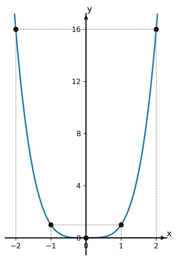 Graf tvoří parabola čtvrtého stupně. Vidíme, že je souměrný podle osy y a funkce je tedy sudá.