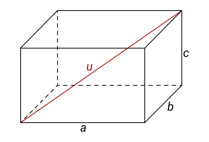 Pro výpočet jeho tělesové úhlopříčky můžeme použít zobecněnou Pythagorovu větu, kdy jednoduše přidáme druhou mocninu délky třetí strany c pod odmocninu ve vzorci – úplně stejně, jako tam máme druhé mocniny délek stran a a b: