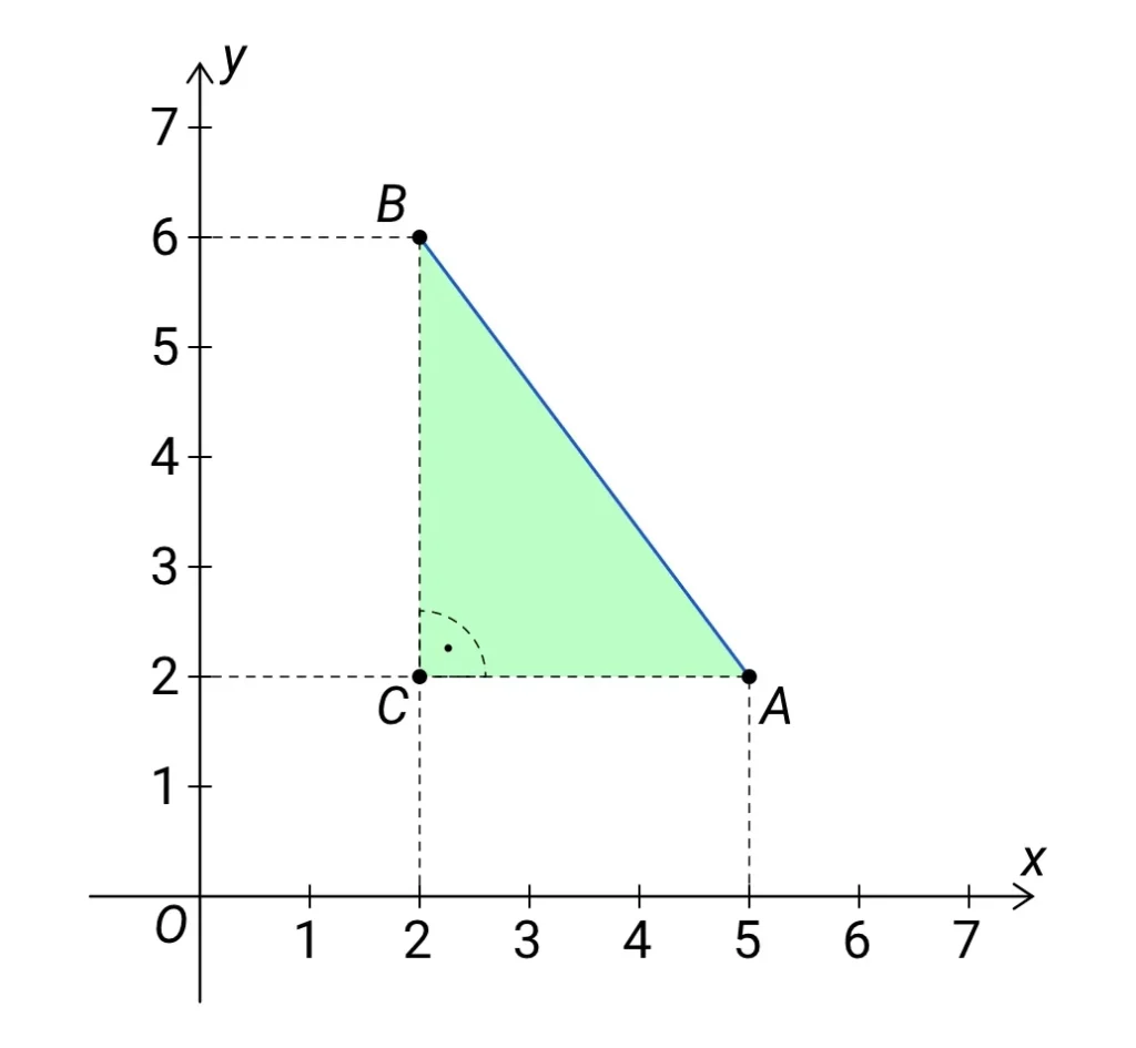 Obdobně délka odvěsny BC je dána rozdílem y-ových souřadnic bodů B a C. Protože y-ová souřadnice bodu C je stejná jako y-ová souřadnice bodu A, můžeme říct, že délka odvěsny BC je dána rozdílem y-ových souřadnic bodů B a A.